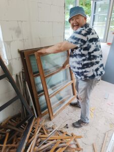 Dann sahen wir einen großen Stapel mit den alten Fenstern. Wir bekamen die Ansage: „Das ist eure Aufgabe. Die alten Fenster sind zu demontieren und für die Entsorgung muss das Material getrennt werden.“ Nach und nach fanden wir einen guten Weg: die alten Fenster zu demontieren und das Glas herauszutrennen. Wenn wir einige Fenster demontiert hatten, kamen immer wieder neu herausgerissene Fenster dazu. Über das Dach konnten wir den Abfall getrennt entsorgen, da unten Container aufgestellt waren. Hier und da ergab sich auch das ein oder andere Gespräch mit den Handwerkern. Auch am nächsten Tag konnten wir an der Stelle weitermachen.